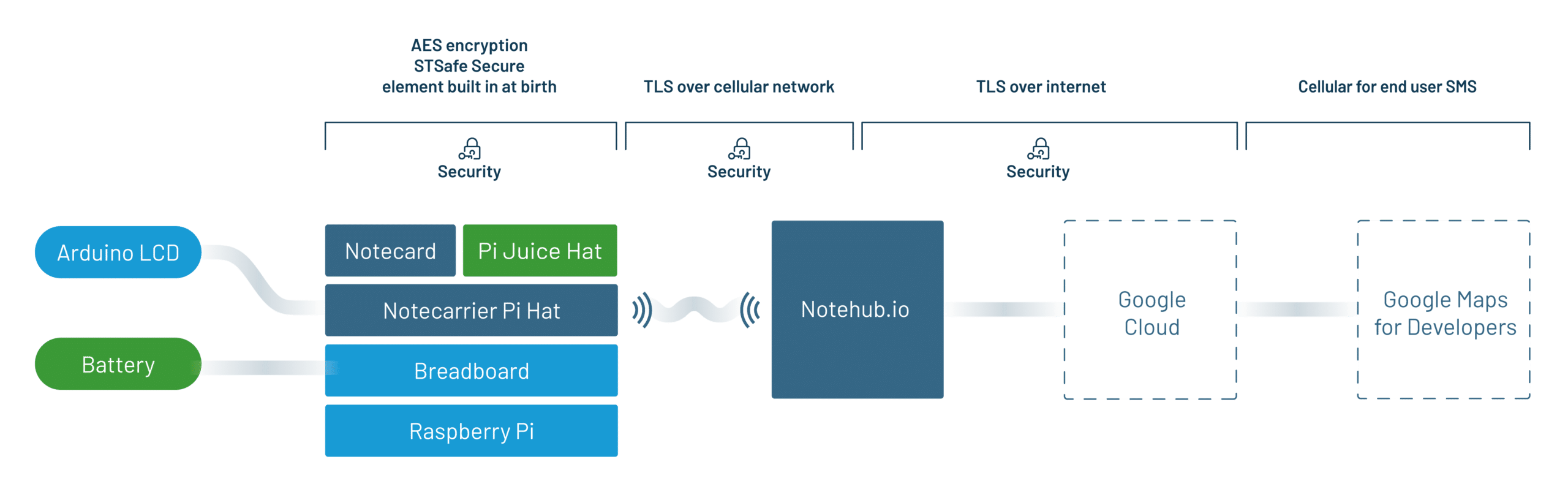 • Wireless connectivity and GPS: Blues Wireless Notecard and Notecarrier