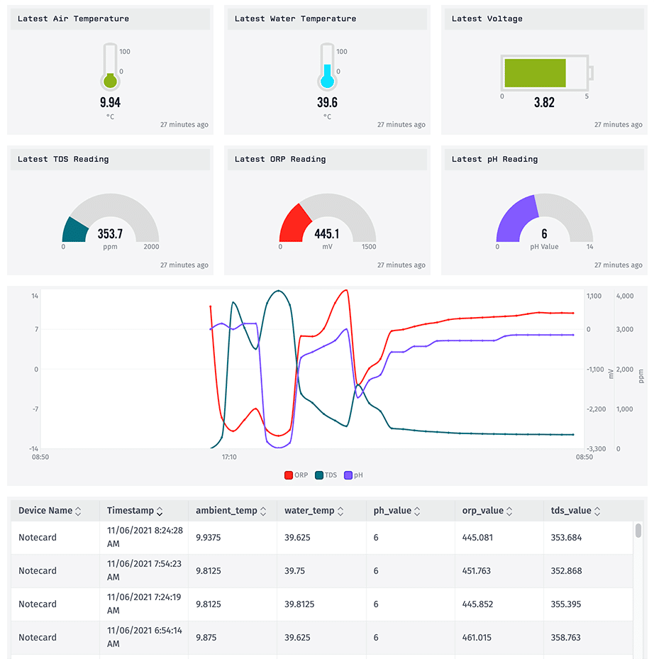 Notehub event data exampleOne of the more complicated parts of the process is building the cloud-based dashboard. Losant provides application templates to build your own development process. There are 5 distinct steps involved when building out a way to ingest and report data within Losant: