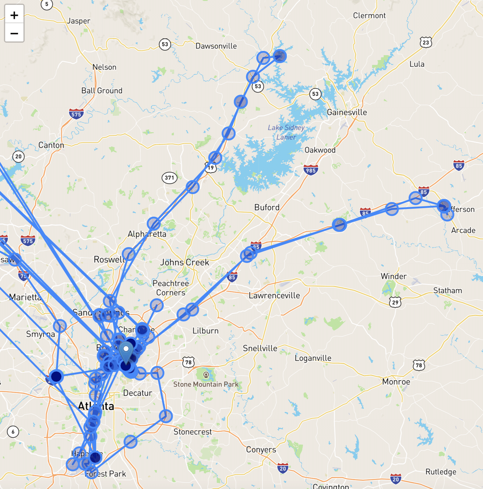 The map is using the React Leaflet library to map all the coordinates from Notehub, display them on the map as blue circles, draw the lines between each circle, and display a marker with clickable tooltip of last recorded location. Mapbox provides the actual map style displayed in the component.