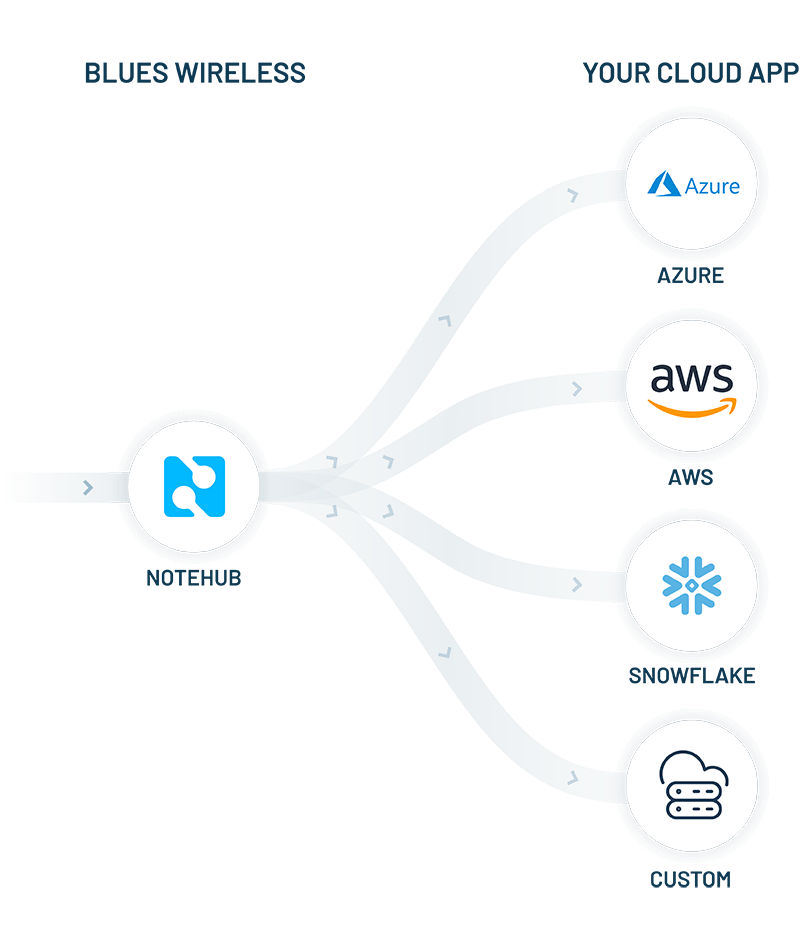 This secure transmission of data often happens using Notehub routes, which help to obfuscate the complexity of integrating with many popular cloud providers.