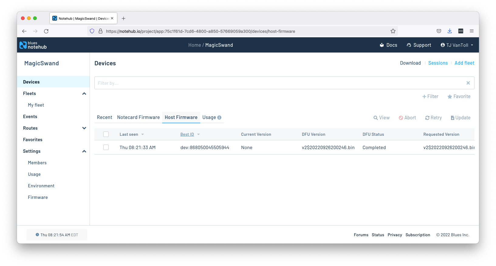 To do that, go to your Notehub project’s Devices page, go to the Host Firmware tab, select all devices you’d like to update host firmware on, and then click the Update button.