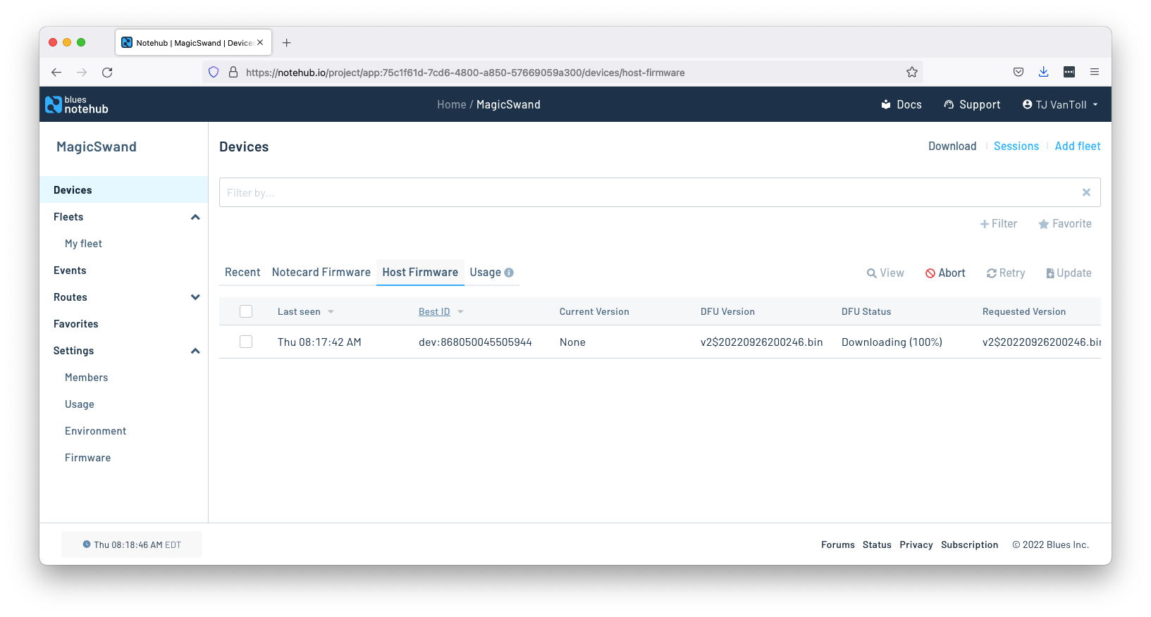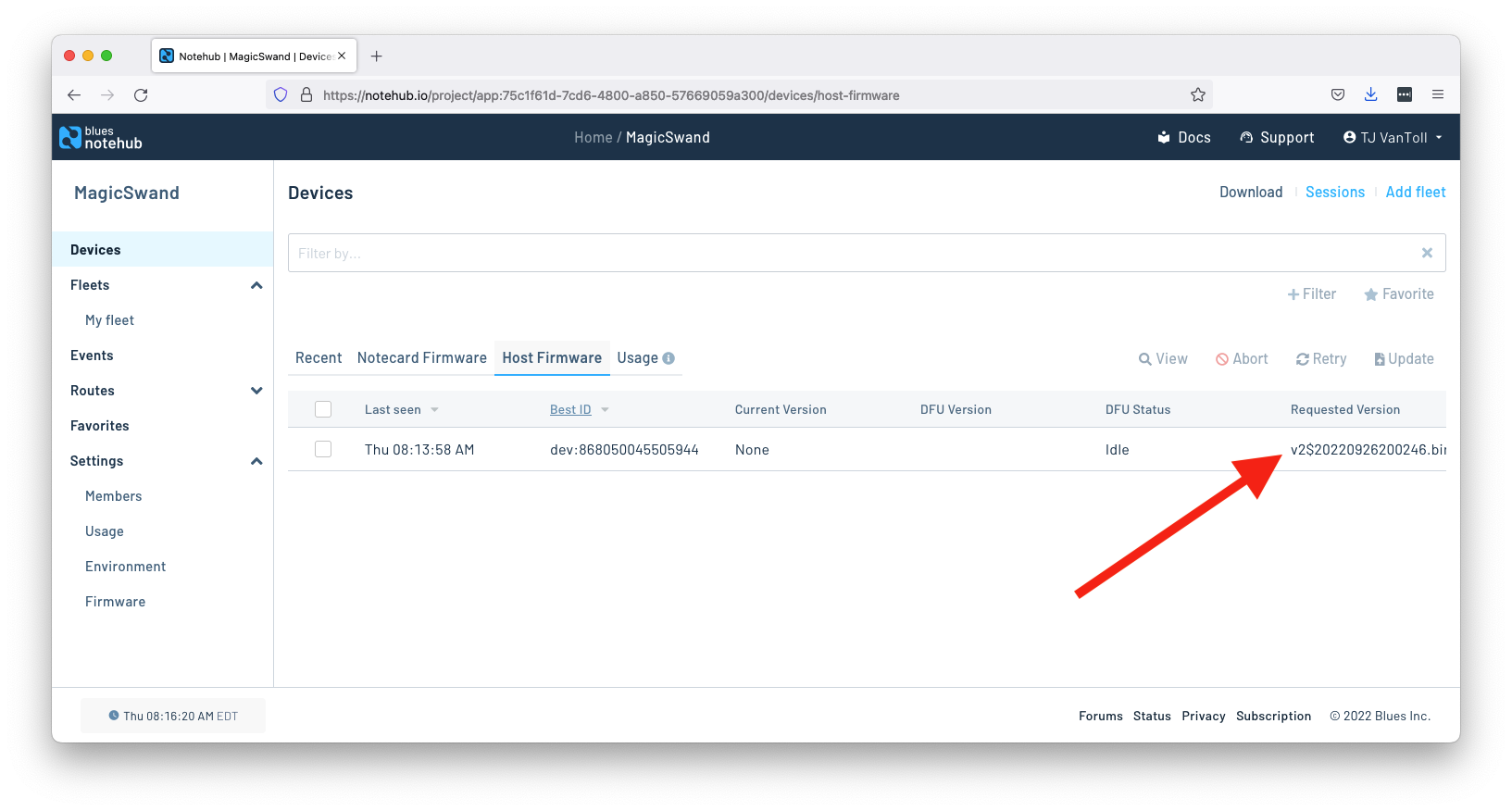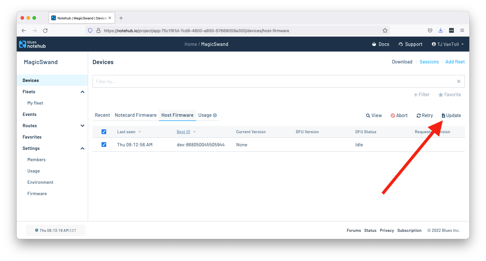 With the new firmware uploaded to Notehub, you next need to tell Notehub to send that firmware to your devices.