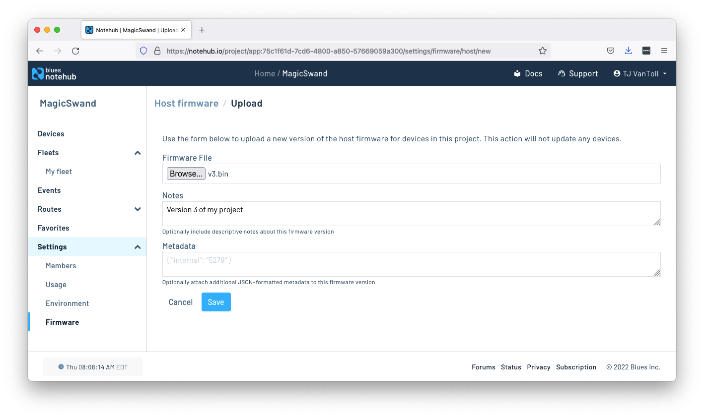 Next, in a Notehub project, navigate to the Firmware page, select the Host firmware tab, and then click Upload firmware.